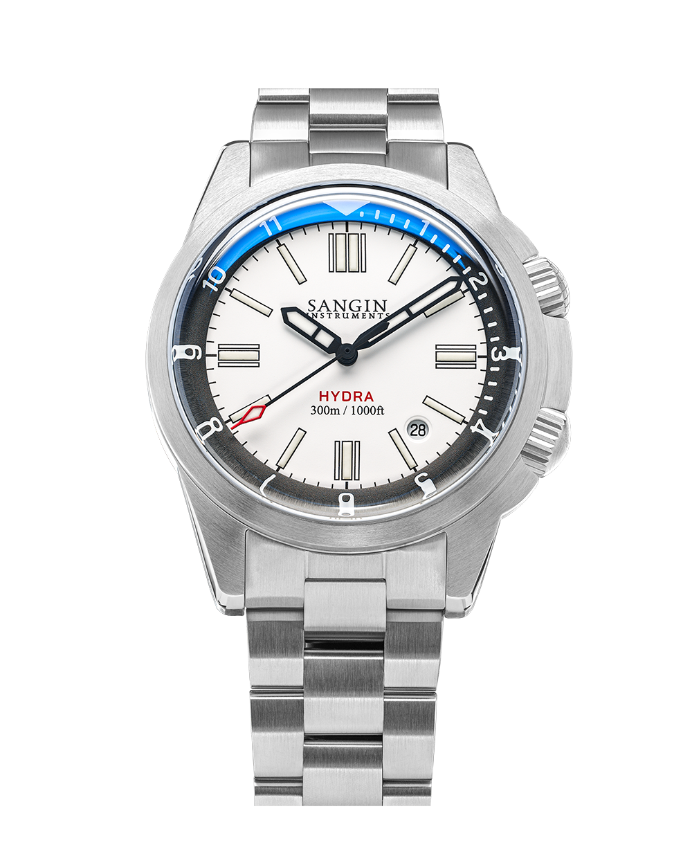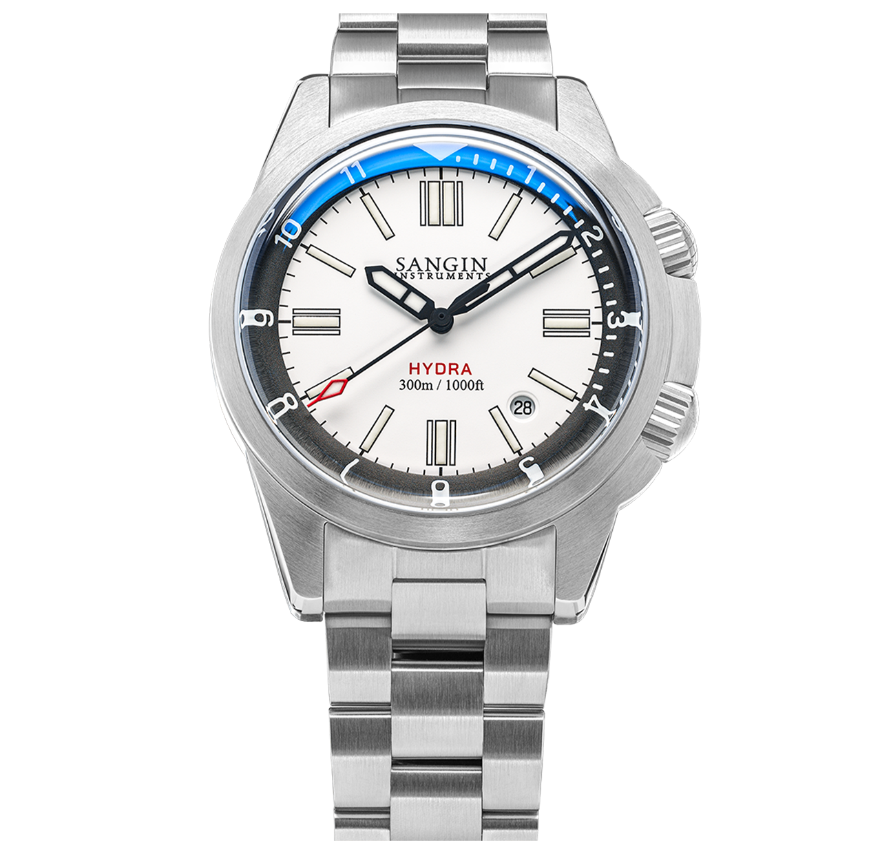 Each Hydra comes with two strap options for maximum versatility. The new fully articulating three-link bracelet features our Superior Divers Clasp (SDC) which is equipped with a ceramic detent flip-lock for extra security and an on-the-fly adjustment module extension system, while the ZAS Admiralty Gray OTAN Strap offers lightweight durability and comfort.