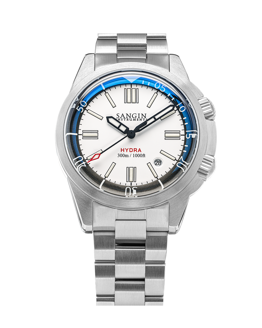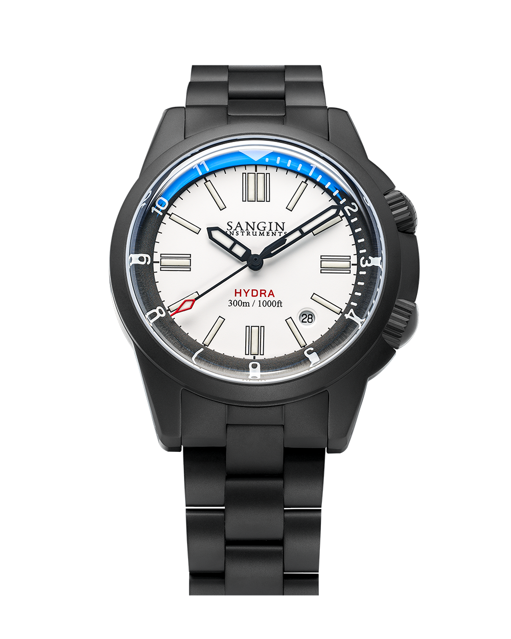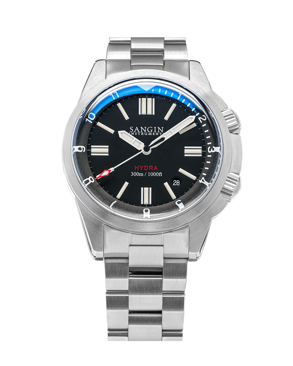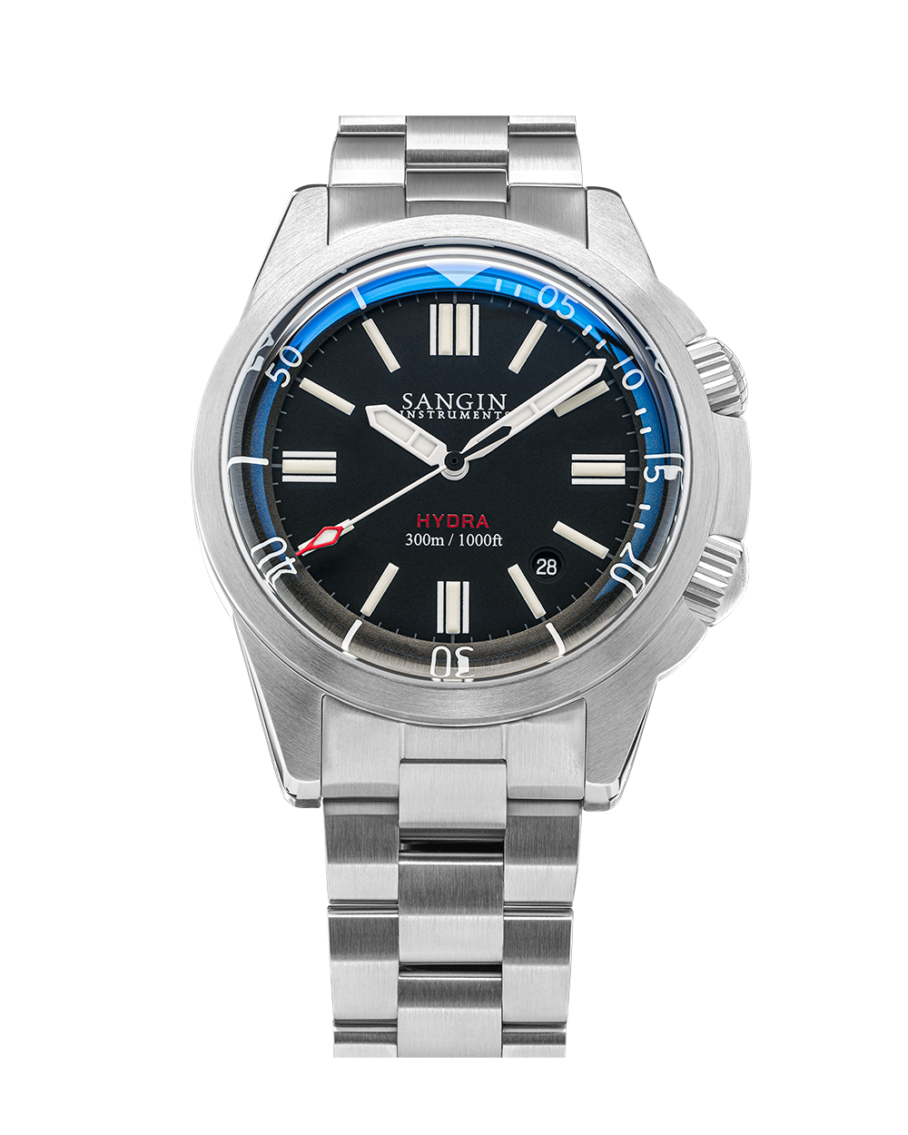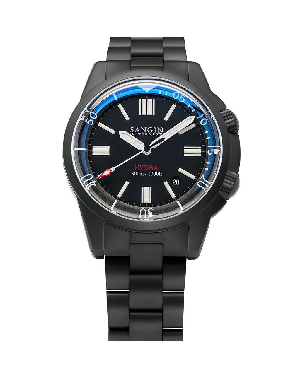The case is forged from corrosion-resistant 316L stainless steel, offering strength and resilience in harsh conditions. Measuring 43 millimeters wide and just 13 millimeters thick, the Hydra wears with presence but remains comfortable and streamlined. A domed sapphire crystal with an internal anti-reflective coating ensures a clear view whether you are navigating low light or direct sun.