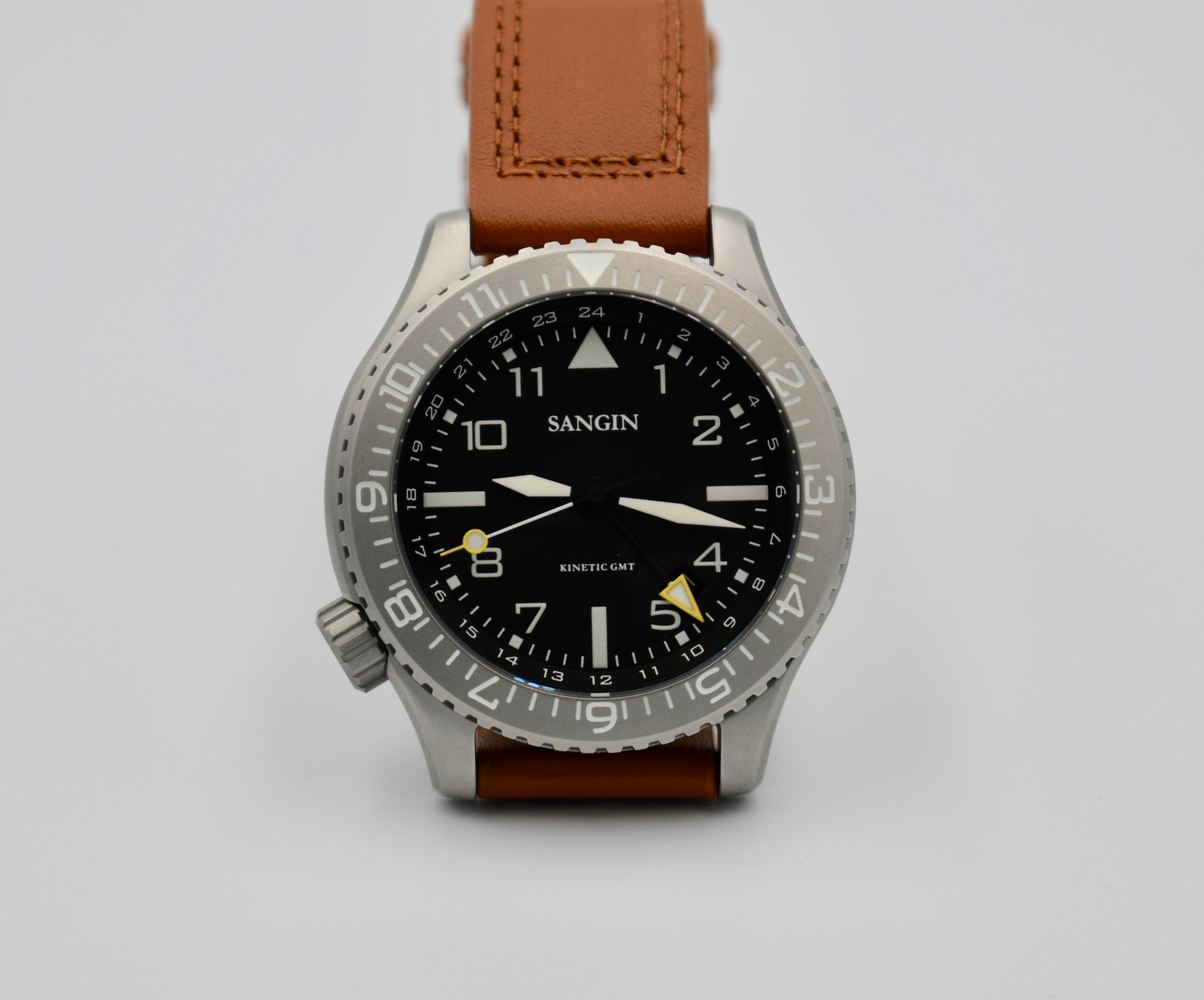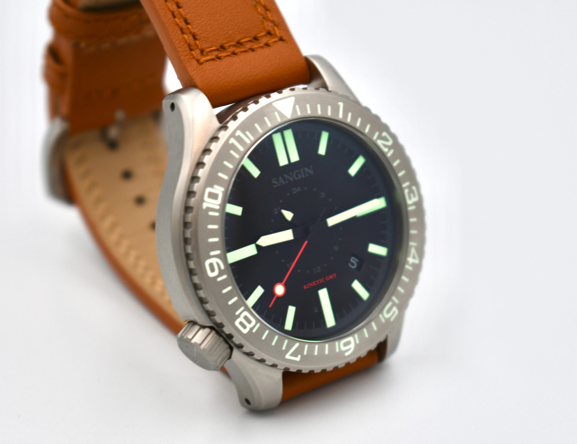 Strap: The Kinetic II will ship on a custom brown (matte finish) / black (DLC finish) leather strap and rubber strap.