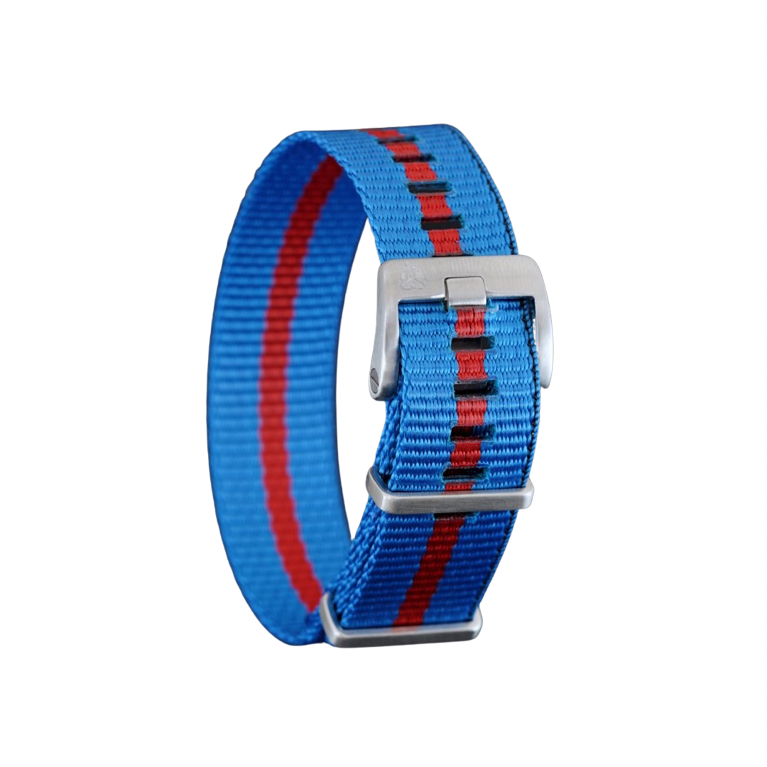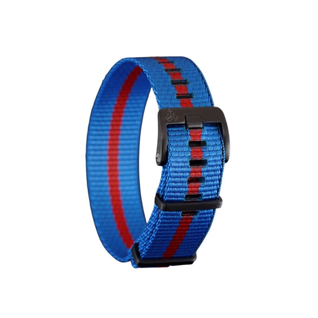 A polyester, tubular, bonded strap in blue and scarlet color pattern.