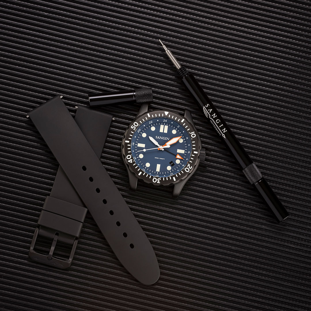 Our lightweight anodized aluminum spring bar tool features threaded caps on both ends to protect the precision tips. One end includes a small forked tip for removing spring bars from watches without lug holes, while the other end has a small pusher tip designed for use with watches that have drilled lugs. Durable and compact, it’s a versatile tool for strap changes and maintenance.